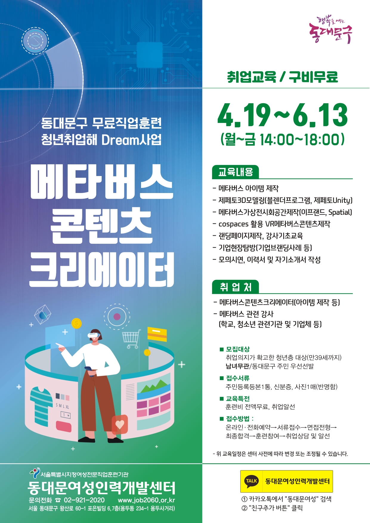 ½Åû ¹Ù·Î°¡±â(Ŭ¸¯)1. °Á°³¿äÁ¦ÆäÅä ºôµå Á¦ÀÛ(3D hous, world, Á¦ÆäÅä 3D¸ðµ¨¸µ, cospaces¸¦ Ȱ¿ëÇÑ VR¸ÞŸ¹ö½º ÄÜÅÙÃ÷ Á¦ÀÛ ±âÃÊ, ±â¾÷ÇöÀåŽÀå, °»ç±âÃʱ³À° µîÀÇ ÈÆ·ÃÀ» ½Ç½ÃÇÏ¿© ¸ÞŸ¹ö½º¸¦ ÀÌÇØÇϰí, °»ç ¹× ¸ÞŸ¹ö½ºÅ©¸®¿¡ÀÌÅͷΠȰµ¿ÇÒ ¼ö ÀÖ´Â ÀÎÀ縦 ¾ç¼ºÇÑ´Ù.2. ±³À°±â°£ : 2023. 4. 19~ 6.13 / ¿ù~±Ý 14:00-18:00 (ÃÑ35ÀÏ/140½Ã°£)3. Ãë¾÷Àü¸Á¸ÞŸ¹ö½º ¾ÆÀÌÅÛ Ã¢¾÷, ¸ÞŸ¹ö½º °ü·Ã °»ç(Çб³,°ø°ø±â°ü,±â¾÷ü µî)3. ±³À°³»¿ë- Á¦ÆäÅäºôµå ÄÜÅÙÃ÷Á¦ÀÛ: 3DHouseÁ¦ÀÛ, World- Á¦ÆäÅä3D¸ðµ¨¸µ(ºí·»´õÇÁ·Î±×·¥, Á¦ÆäÅäUnity)- ¸ÞŸ¹ö½º °¡»ó Àü½Ãȸ°ø°£Á¦ÀÛ(ÀÌÇÁ·£µå, Sparial)- cospaces¸¦ Ȱ¿ëÇÑ VR¸ÞŸ¹ö½º ÄÜÅÙÃ÷ Á¦ÀÛ- ÇÁ·Î¼¼½ÌÀ» ÀÌ¿ëÇÑ À̹ÌÁö ó¸®¿Í VR¸ÞŸ¹ö½º ÄÜÅÙÃ÷ Á¦ÀÛ- ·£µùÆäÀÌÁöÁ¦ÀÛ, °»ç±âÃʱ³À°(°ÀÇ¿¡ ÇÊ¿äÇÑ µðÁöÅеµ±¸)- ±â¾÷ÇöÀ厹æ(±â¾÷ºê·£µù»ç·Ê, ij¸¯ÅÍÆ¼¼ÅÃ÷Á¦À۽ǽÀ)- µðÁöÅнºÅ丮ÅÚ¸µ, ¸ðÀǽÿ¬, À̷¼ ¹× ÀÚ±â¼Ò°³¼ ÀÛ¼º4. ±³À°Æ¯Àü¼ö°·á, ±³Àçºñ, Àç·áºñ ¹«·á/ Ãë¾÷¿¬°è* Á¢¼ö¹æ¹ý :¨ç ȨÆäÀÌÁö ¼½Ä ÀÚ·á½Ç¿¡ <µ¿´ë¹®±¸-û³âÃë¾÷ÇØµå¸²Âü°¡½Åû¼>¿Í <À̷¼>¸¦ ÀÛ¼º ÈĸÞÀÏ(d-2020@hanmail.net)·Î ¹ß¼Û (¸ÞÀÏ Á¦¸ñ¿¡ '¸ÞŸ¹ö½º' Áö¿øÇÑ´Ù°í Àû¾îÁÖ¼¼¿ä)¨è 1Â÷ ¼·ùÀüÇü ÇÕ°ÝÇϽŠºÐ²²¸¸ °³º° ¿¬¶ôÀÌ °©´Ï´Ù.(¸éÁ¢ÀÏÀº 1Â÷ ÇÕ°ÝÀÚÇÑÅ׸¸ ¿¬¶ôÇØ µå¸± ¿¹Á¤ÀÔ´Ï´Ù.)¨é ¼¾ÅÍ ¹æ¹®ÇÏ¿© 2Â÷ ¸éÁ¢ÀüÇü ÁøÇà¨ê ¸éÁ¢¿¡ ÃÖÁ¾ ÇÕ°ÝÇϽŠºÐµé¸¸ ÈÆ·Ã¿¡ Âü¿©ÇÏ½Ç ¼ö ÀÖ½À´Ï´Ù.@±¸ºñ¼·ù : Áֹεî·Ïµîº»1Åë, ½ÅºÐÁõ, »çÁø 1¸Å(¹Ý¸íÇÔÆÇ)@Á¢¼ö¹æ¹ý : ¿Â¶óÀÎ Á¢¼ö-> 1Â÷¼·ùÀüÇü->°£´ÜÇÑ ¸éÁ¢À» ÁøÇàÇÕ´Ï´Ù.@¹®ÀÇÁ¢¼ö: 921-2020 µ¿´ë¹®¿©¼ºÀη°³¹ß¼¾ÅÍ´ã´çÀÚ: ±èÀ¯Áø